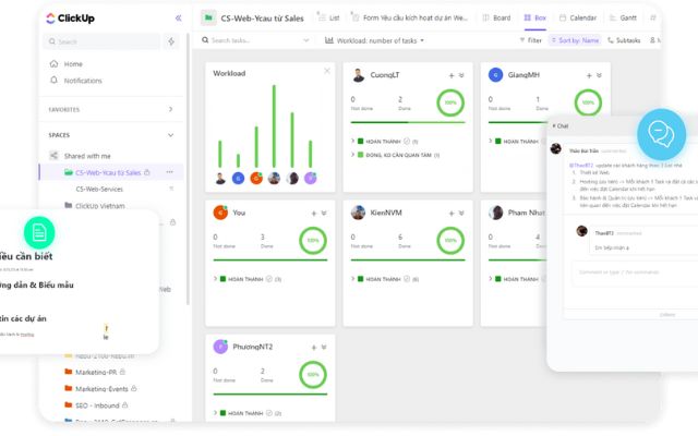 - Hệ thống phân cấp linh hoạt: Sắp xếp công việc theo nhiều cấp độ: Không gian > Thư mục > Danh sách > Nhiệm vụ > Nhiệm vụ phụ > Checklist.